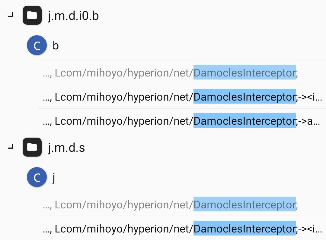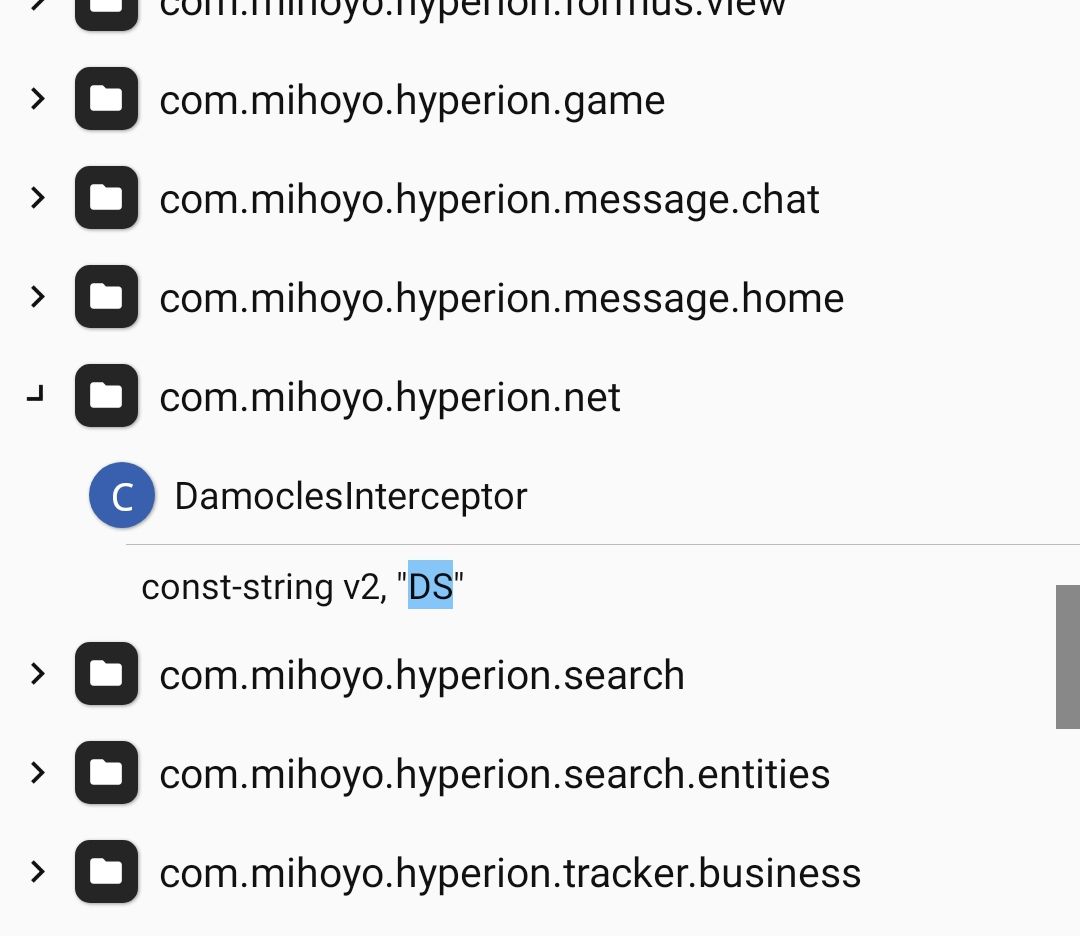找到 809 个结果,不过也没啥,明显android.xxxcom.google.xxx之类的应该没啥关系,直接看com.mihoyo.xxx的就行。不太清楚为啥 MT 管理器搜索代码的时候就不能全字匹配,不过也无所谓,人工全字匹配也罢。
